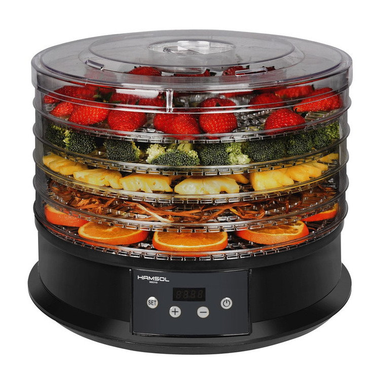 میوه خشک کن هامسول با صفحات چرخان جهت بهتر خشک کردن میوه و سبزیجات طراحی گردیده که دارای 5 طبقه با ارتفاع کم است که این ارتفاع کم باعث می شود میوه ها در زمان کوتاه تری خشک شوند . دستگاه دارای تایمر دیجیتال آلارم پایان زمان خشک کن می با شد . دمای مورد نیاز میوه خشک کن بین 40 - 70 سانتیگراد می باشد .